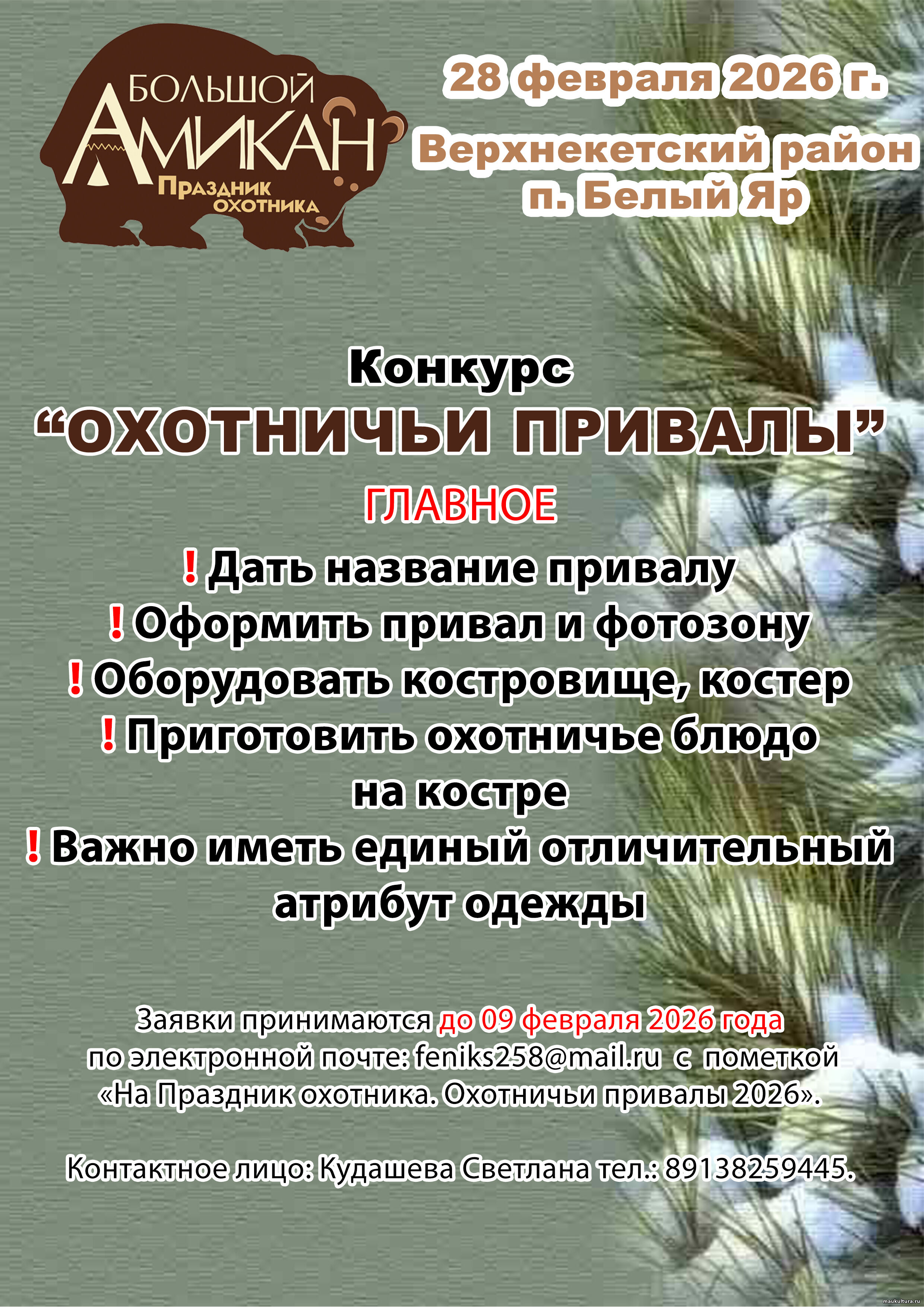 7 марта состоится уже третий Праздник охотника «Большой Амикан». Подготовка к нему уже идет. Очень надеемся, что «Большой Амикан» станет не просто ярким событием, он откроет новые возможности для верхнекетцев, а гостям позволит познакомится с нашим удивительным таежным краем.