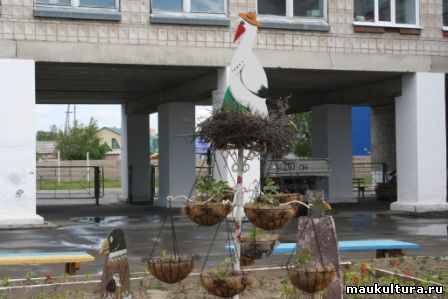 Но не только цветы украшают школьную округу. Каждый год появляются на территории новые арт-объекты, которые становятся своеобразными символами школы. Центральную клумбу украшает пара аистов, которая символизирует уважительное отношение к семейным ценностям, нежное и бережное отношение к детям – нашему будущему. C установкой этой деревянной скульптуры на улицах райцентра появилось большое количество родителей с колясками. Значит наш аист-волшебный!.
