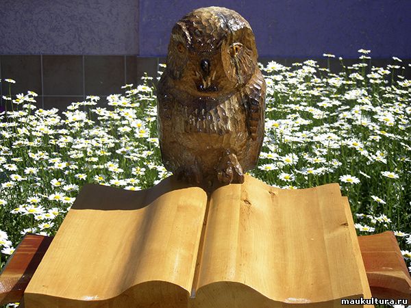 Эта деревянная скульптура была создана А. Черкесовым, и сразу стала местом посещения студентов и учащихся. И в районе с открытием «Мудрой совы» появилась легенда, о том, что тот, кто потрет страницы книги и клюв птицы, успешно сдаст все экзамены.