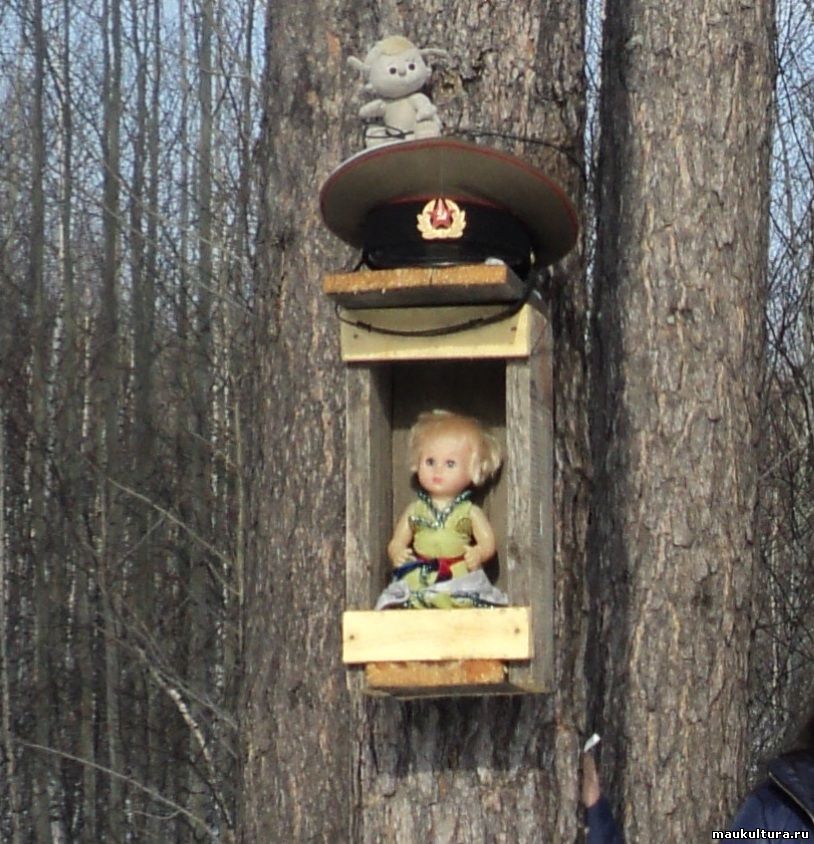 Лет 15 назад подобрал на дороге куклу А.И. Титлов и пристроил ее под сосной, затем домик ей соорудили на стволе этой сосны, одевают ее, копейки на счастье оставляют. Особенно в распутицу говорят: - "Вот доедем до "Машеньки", отдохнем".
